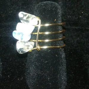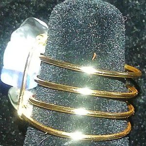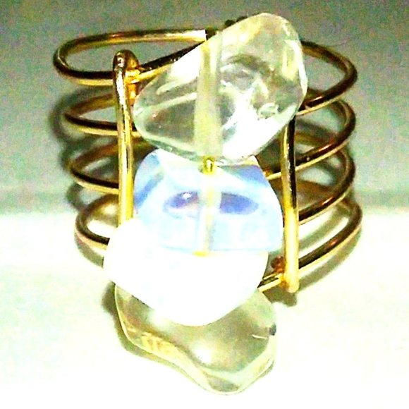 This very special and unique ring is an eye catcher. The setting consists of four opalite stones closed with gold toned copper. Comfortable fit. Goes with any attire. The ring fits U.S. size 5.5 to 6. The is a ring fit for any attire. It can be used as a stackable statement ring.