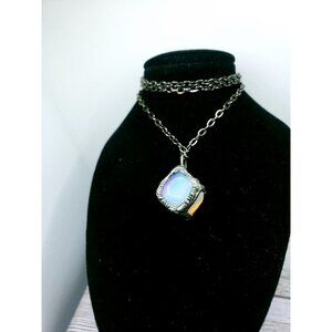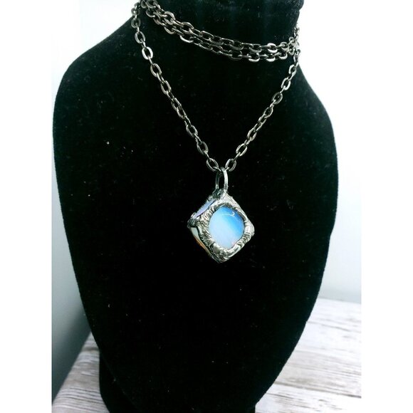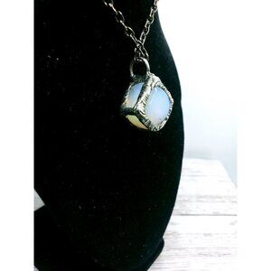 A cute little cubed shaped opalite necklace. These are crafted from a silver bearing low alloy and a cube shaped opalite stone. The metalwork was patinaed and sealed off to keep its current beauty.