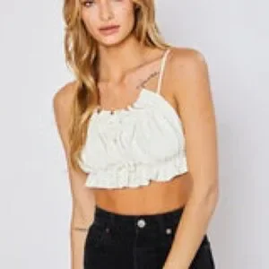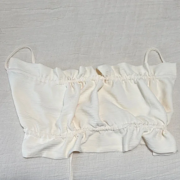 Soft white cropped tube top with ruched detailing. Adjustable drawstring and thin shoulder straps. Lightweight and versatile for layering.