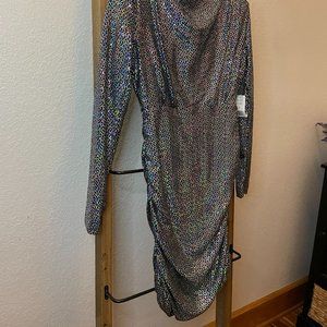 Alexia Admor Open Back Mini Dress in Metallic Silver with metallic design, cowl neck, ruched sides, long sleeve and open back, Center back zipper with Hook-and-Eye closure, Dress has shoulder pads, Approximately 32 inches from shoulder to hem, Size Chart in Photos, Color is Silver and Black with the Metallic reflections of all colors depending on light.