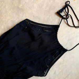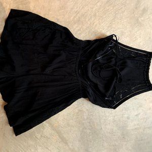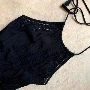 Open back, black romper features detailing, adjustable ties and a slimming cinched waist!