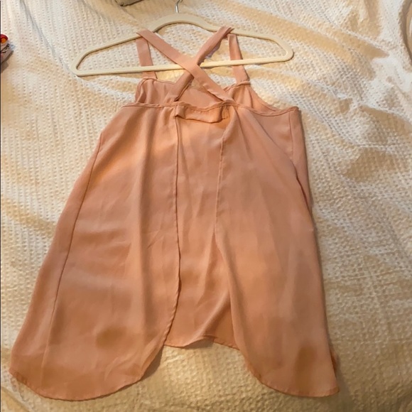Light Pink open backed top. Crosses in the back. Easy to put over a fun back sports bra
