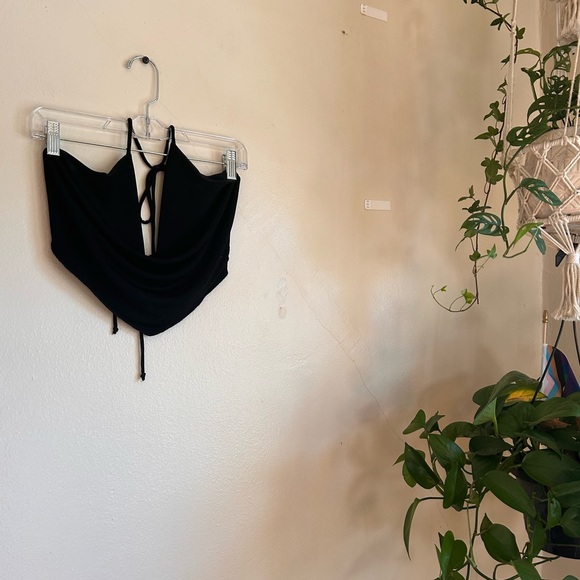 Black stretchy, shiny material, string tie neck and back, swoopy chest area/adjustable fit. Never worn but tags have been removed, in perfect condition. All photos are taken in natural daylight without filters added. Price firm.