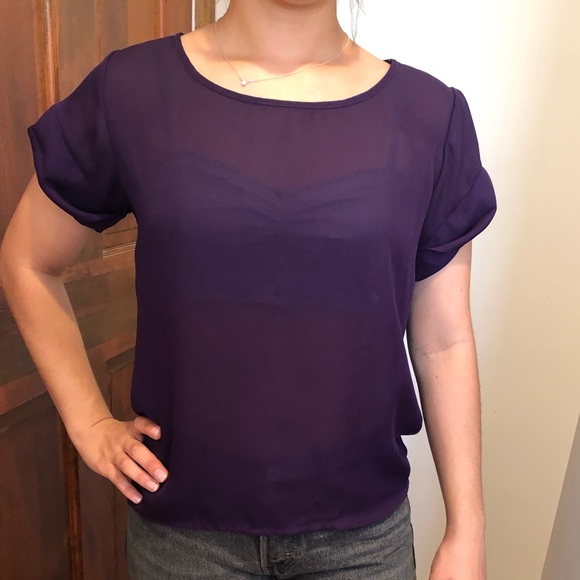 Sheer purple top with open back detailing. Feel free to leave any questions and be sure to check out my other listings for extra savings when you bundle :)