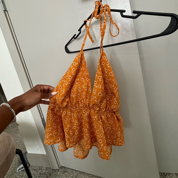 Yellow/ bright orange open back halter top with white flowers. Flowy at bottom