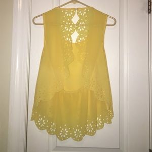 Yellow open back tank. Size large but fits more like a medium. It is slightly cropped.