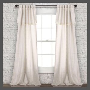 This quaint yet trendy Ivy Tassel Window Curtain Panel Set adds subtle flair to your living space. A row of tassels hanging near the top adds a delicate touch of pizzazz to the solid color window curtains. These curtains are perfect for your bedroom or living room. The Ivy Tassel Window Curtain Panel Set is sold by the pair and each individual panel measures 40 inches wide. You have a choice of three lengths, including 63 inches, 84 inches and 95 inches. You have many options for hanging this Ivy Tassel Window Curtain Panel Set as it is made with a 3" back tab rod pocket. So, you can hang them with the back tabs, with the rod pocket, or with clips. When it comes time to care for the Ivy Tassel Window Curtain Panel Set, we do recommend dry cleaning, as the ruffled layer and tassels are delicate. However, you may machine wash and tumble dry. Please follow the full care instructions on the label.