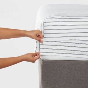 Give your bedding a luxurious feel with the 400-Thread Count Performance Fitted Sheet from Threshold. Made from 100% cotton, this fitted sheet brings you year-round comfort, and the sateen finish lends a noticeable sheen to add depth and richness to your bedscape. It includes a full perimeter elastic that stretches to fit multiple mattress depths and holds it in place for a great fit. Plus, the machine-washable construction makes cleaning a breeze. Room Essentials: Everyday Value