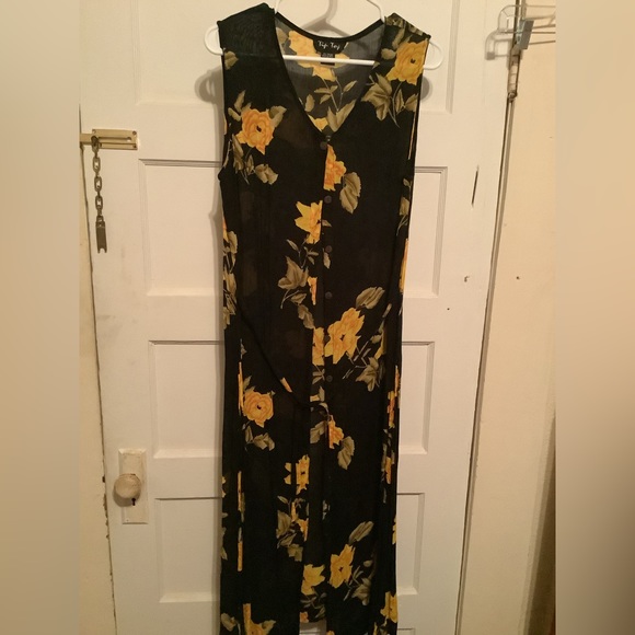 Yellow flowers print, ankle length, button down front with open split 100% rayon (can be worn over bathing suit)