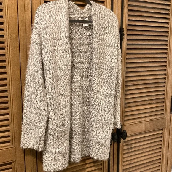 Fuzzy mostly cotton cardigan. Open front, two pockets, notched back collar. SUPER CUTE! EUC. Smoke & pet free home.