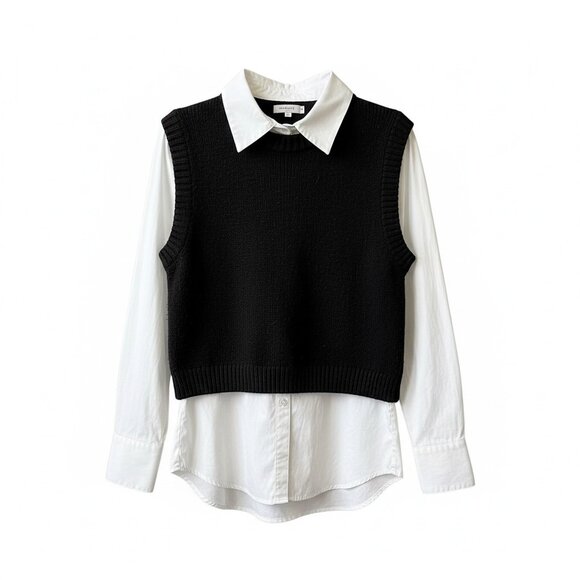 Chic and versatile one piece featuring a crisp white button-up mock shirt with an attached black sleeveless sweater overlay. This piece gives the polished look of a styled outfit with the ease of one item.