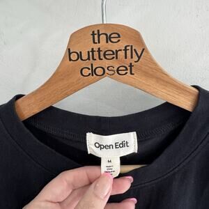 Open Edit Pintuck Cinched Waist Short Sleeve Black Tee Medium LS