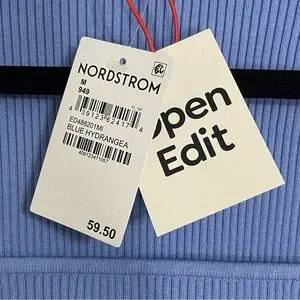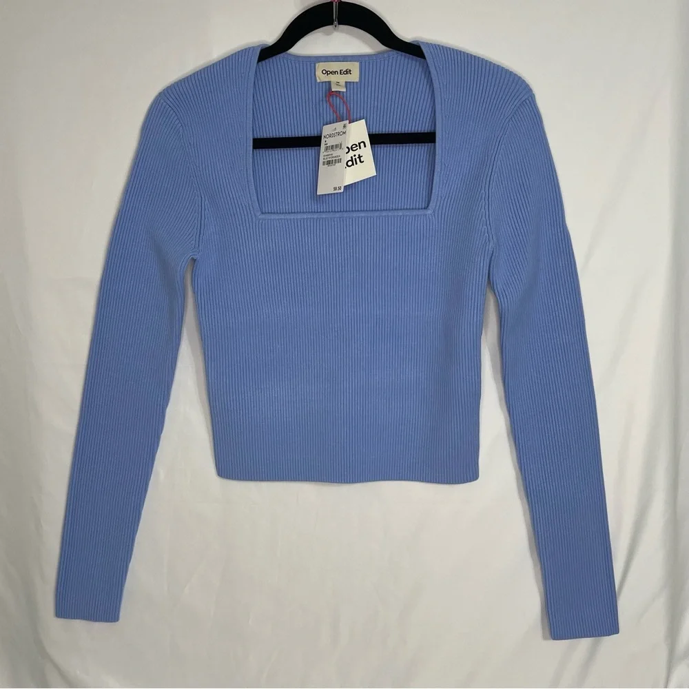 Kind of a chunky or thicker knit. Pretty blue. Not a crop but shorter length.