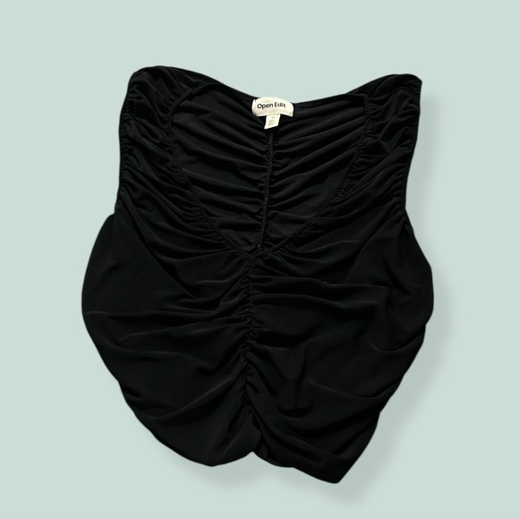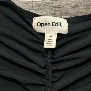 Description: Open Edit black ruched tank. Sleek, flattering, and easy to dress up or down.