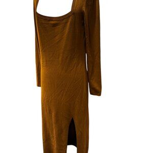 Chic and minimalist Open Edit ribbed sweater dress in a warm camel brown tone. Features a flattering square neckline, long sleeves, and a back slit for ease of movement. Soft, stretchy knit fabric offers a comfortable yet polished fit — perfect for fall and winter styling.