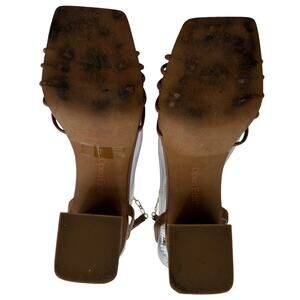 Open Edit Clarissa heeled sandals. A flared block heel and gilded ankle chain secure a strappy sandal fronted by a squared toe. Synthetic upper and lining. Rubber sole. Color name is tan mocha. Chain is gold toned. In preowned condition.
