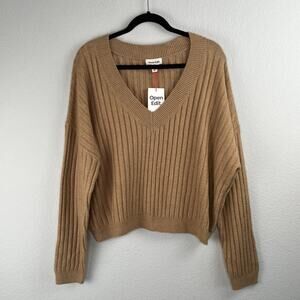 Open Edit Tan V-Neck Ribbed Knit Long Sleeve Drop Shoulder Pullover Sweater Size XL NWT