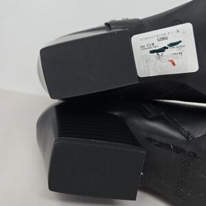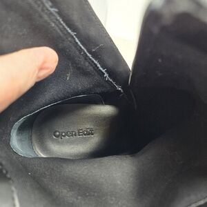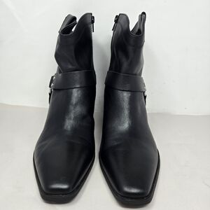 The Open Edit Women's Enzo Western Flare Boots in size 8.5M are stylish black leather ankle boots with a square toe and mid-height block heel. They feature a side harness detail, perfect for adding a trendy touch to any outfit. Ideal for travel, parties, or casual wear, these boots have a Western theme with a rodeo or cowgirl vibe. Made with high-quality leather and synthetic lining, these boots are durable and comfortable for all-day wear. The Enzo Western Flare model from Open Edit is a fashionable choice for any woman looking to make a statement with their footwear.