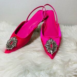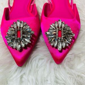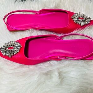 These stunning pink slingback flat shoes feature a luxurious crystal embellishment