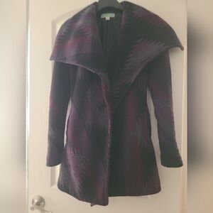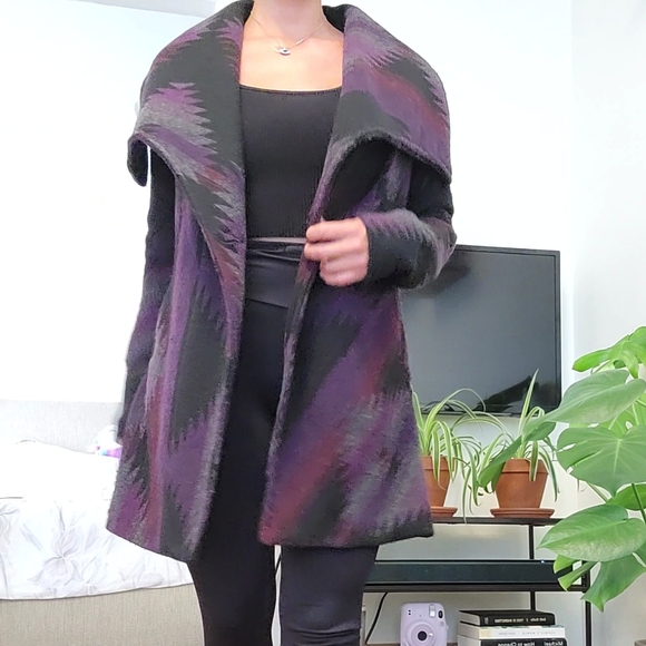 Upgrade your fall wardrobe with this chic open-front cardigan featuring a trendy Aztec print in deep shades of purple, black, and subtle hints of maroon. Perfect for layering over any outfit, this cardigan is as cozy as it is stylish.