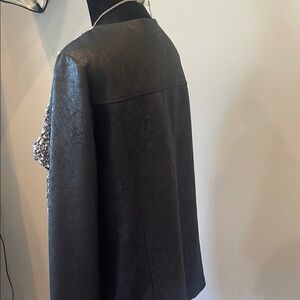 Open Front Cardigan black leather back and sleeves with blue and white fabric
