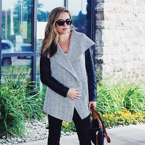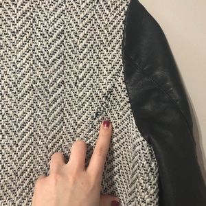 Super chic cardigan- It's got black and white woven material and faux leather black sleeves. Unfortunately, there was never a tag with a brand on it or a size! The only tag on it says dry clean only. I purchased it from a boutique in Muskegon, MI called Sparrow. I am a size 6 and usually buy a medium top. It's a nice long fit and looks great with leggings or black jeans.This cardigan is in great condition aside from a minor imperfection on the back (pictured). 14.5" shoulder. 26.5" length.