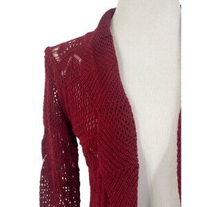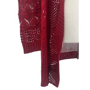 Boho, Bohemian, Southwestern, Western, Coastal Cowgirl, Waterfall, Draped, Asymmetrical, Open Front, Knit, Vest, Layering, Layers, Fall Cardigan, Winter Sweater, Red, Burgundy, Crochet, Crochet Cardigan, Open Stitch, Feminine, Casual, Casual Boho, Relaxed