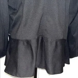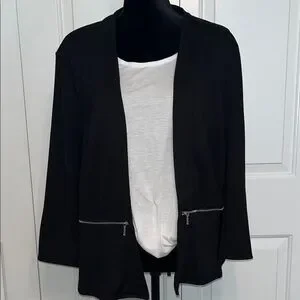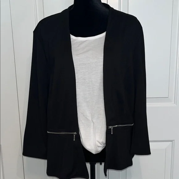 Open front jacket with 3/4 sleeves and a peplum at the bottom. Silver zippers accent the front. They zip but no pocket. Polyester/rayon/spandex blend for a comfy fit. Size XL.