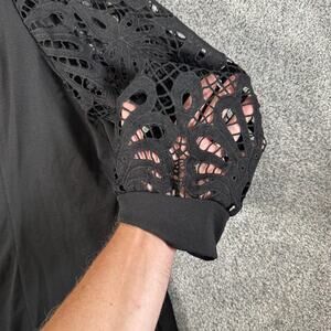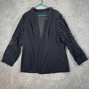 Features: Sheer crochet lace long sleeves; open drape front; cuffed sleeve hems; banded collar; lightweight stretch knit body