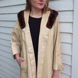 Open Front Leather Coat 60s Champagne Ivory Pleather Fur Trim Midcentury