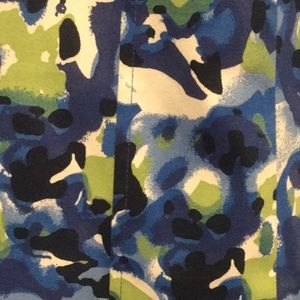 Spring open front lined jacket in beautiful blue and green hues giving it a watercolor look. Worn only one time. Lining is blue and has a hook fastener at neck. Size 14/16