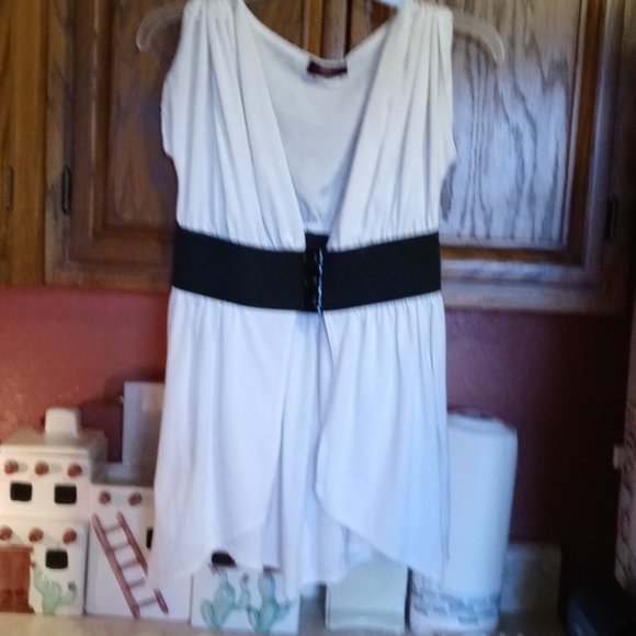 White gathered capped sleeves, high/low hemline, deep & wide neckline that opens up all the way down. The black wide stretch belt w/3 snaps only holds this top together.