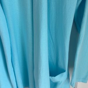Pretty blue open front cardigan. Nice lightweight fabric. Ideal for layering. Features long sleeves and front pockets.