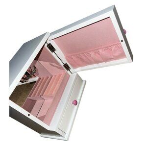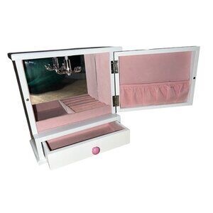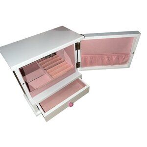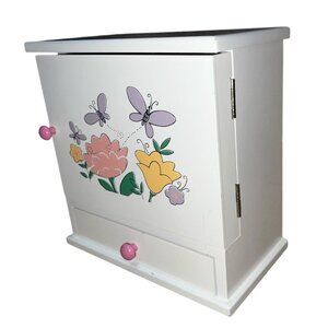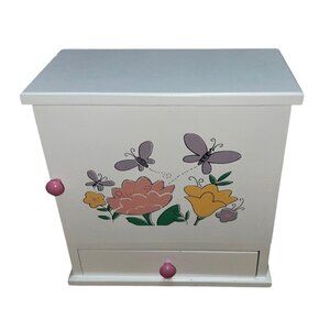 This Open Front Wooden Jewelry Box Chest for Girls is a charming 8" x 8" storage solution adorned with beautiful flowers and butterflies. It features a convenient drawer for additional storage space. This is manufactured by King Wood Company