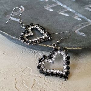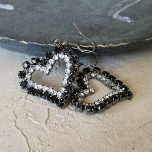 Most of our BIN items also have "Make an Offer" enabled, so you can submit an offer! About This ItemAustrian Crystal Open Heart Gunmetal Grey Black and Clear Dangle EarringsProng set black and clear Austrian crystal rhinestonesMetal is gunmetal plated brassMeasures approximately 30x28mm