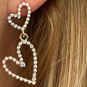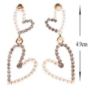 Fashionable and cute dangle heart post earrings with clear crystal and faux pearl accents. Lovely earrings that make a sophisticated statement.