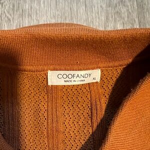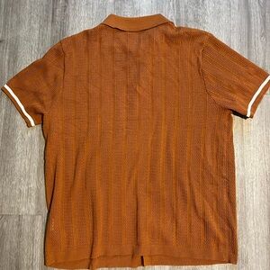 Burt orange, open knit sweater-style button down shirt. White piping along the pockets and sleeve. Great for summer and fall!