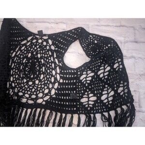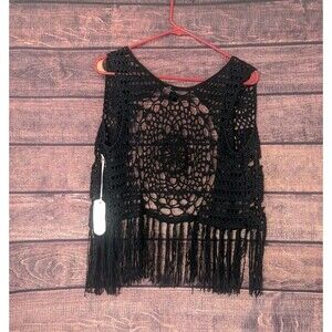 Open Knit Sweater Vest Black Size S/M Fringe Boho Festival Mandala