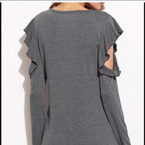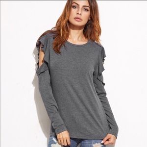 Gray open ruffle shoulder top. 60% polyester, 35% rayon, 5% spandex. Long sleeve. Fabric is stretchy. 39” bust, 26.6” length.