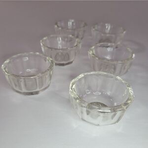 Open, round salt cellars are vintage glass with deep cuts and a star design on the bottom. This lot of six salts are in perfect condition and are very sweet. An ideal addition for your hutch or a gift for someone special.