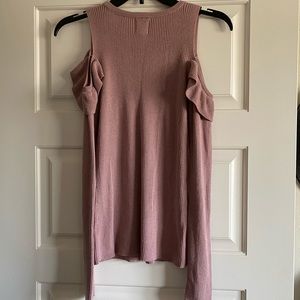This Lilac ribbed knit sweater features a crewneck, shoulder cut-outs and a ruffle detail. It is fitted thus fits more like a S/M than a Large. Style for business or casually, color or neutrals, Skirt or pants, layered or let it speak for itself!
