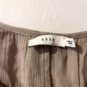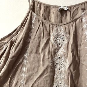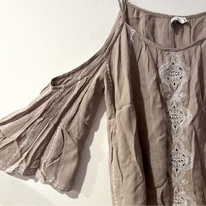 Lush open shoulder flowy tank. Adjustable straps with beautiful detail on front and arms. Ruffled arms openings. Beige coloring. Very good condition!