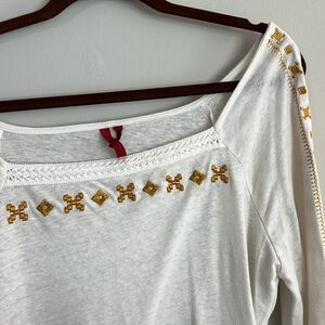 Open Shoulder White 3/4 Sleeve Shirt with Yellow Gold Stiching