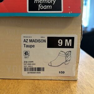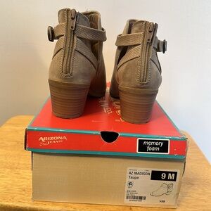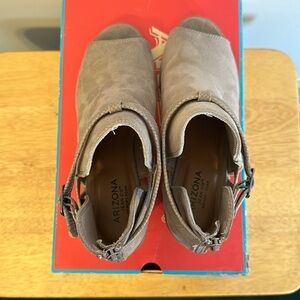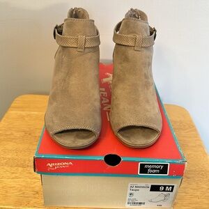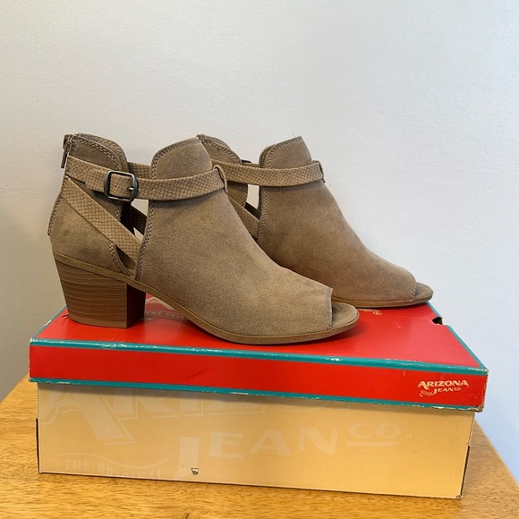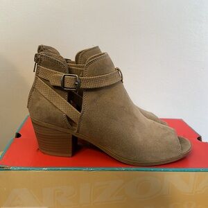 Taupe colored, open toe, Arizona Jean Co bootie. Zipper back.