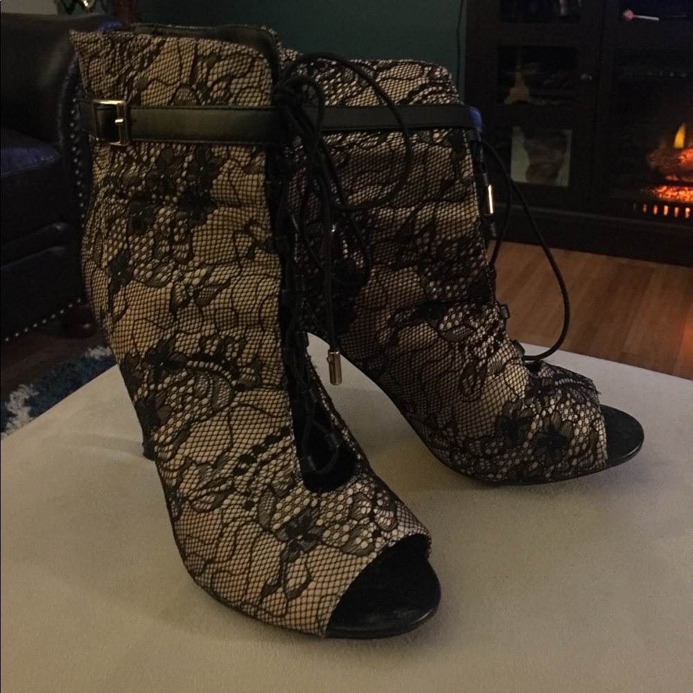 These cutie booties lace up the front and have a zipper in the back. The booties have a nude underlay with all black lace overlay. In great condition as you can tell by the heel. Wore less than 5 times.