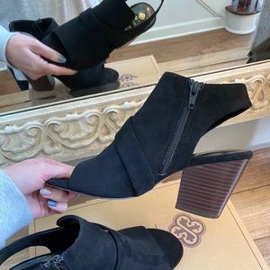 Like new open toe booties, in excellent condition! Color is black, and the boots are so soft (like a suede material). I bought them and just never got around to wearing them. Comes with the box.