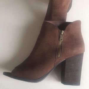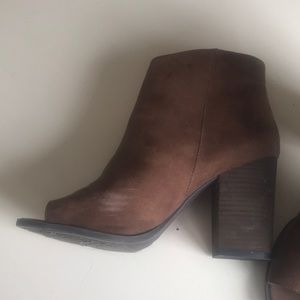 Carlos Santana open toe booties. Chocolate brown suede. Two small visible scuffs shown in pictures.