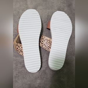Add a lively print to your warm-weather wardrobe with the Fennie by Journee Collection. This backless sandal features vegan leather dual straps at the vamp with printed two-tone details. A clean white wedge heel and a padded footbed ground this breezy look. Adjustable hook & loop closure for a custom & secure fit. Only worn around my house once. My feet grew two sizes during pregnancy so these unfortunately no longer fit. I have another pair in a different print available as well (last few pics). Originally $50!