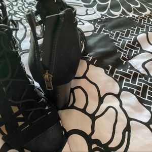 Cutout heeled bootie with open toe. Features a stacked heel and lace up closure.