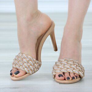Open Toe High Heel Sandals Nude Braided Rhinestone Band Heeled Mule